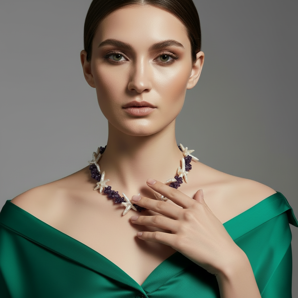 Intricately designed statement necklaces featuring lustrous pearls and vibrant gemstones. Each piece...