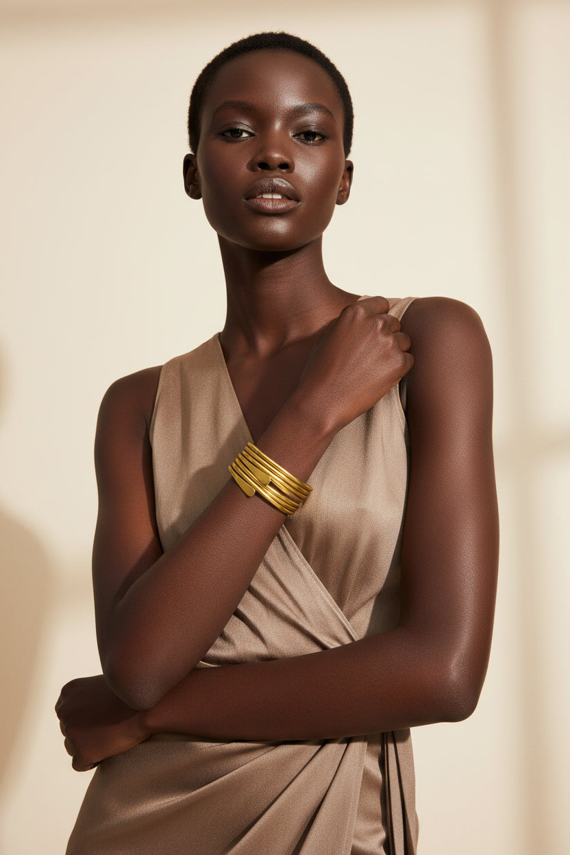 Sculptural sealed brass bangles polished to a warm, golden finish. Shown here...